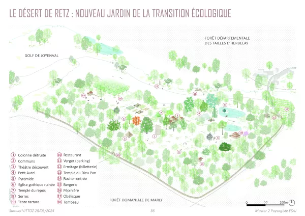 Ce projet explore les stratégies d’adaptation des végétaux dans les jardins historiques, un défi accentué par le changement climatique. Le projet se concentre sur le Désert de Retz, jardin pittoresque du XVIIIe siècle. L’objectif est de concilier préservation historique et résilience écologique, en proposant des solutions respectueuses de l’identité du lieu tout en anticipant les transformations climatiques. Le projet interroge la manière de conserver les espèces originelles ou d’introduire de nouvelles végétaux adaptées, en prenant en compte les enjeux patrimoniaux et les spécificités microclimatiques du site. Ce travail vise à créer un équilibre entre héritage historique et adaptation contemporaine, assurant la pérennité du jardin pour les générations futures.