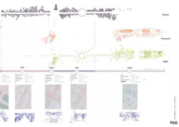 Percer pour voir : Essayer de voir plus loin pour mieux comprendre. Mais comment percer un paysage? Après l'expérimentation de quelques-unes de ses définitions, il faut finalement accepter que la vérité d'un paysage n'est probablement pas la même pour tout le monde et c'est ce qui fait la beauté de notre existence. Alors pour aborder un tout, regardons un bout; dans un cadrage. Cette fenêtre s'est dévoilée dans le tracé de Paris. Un axe, un trait fort dans le paysage urbain, l'axe historique de Paris.